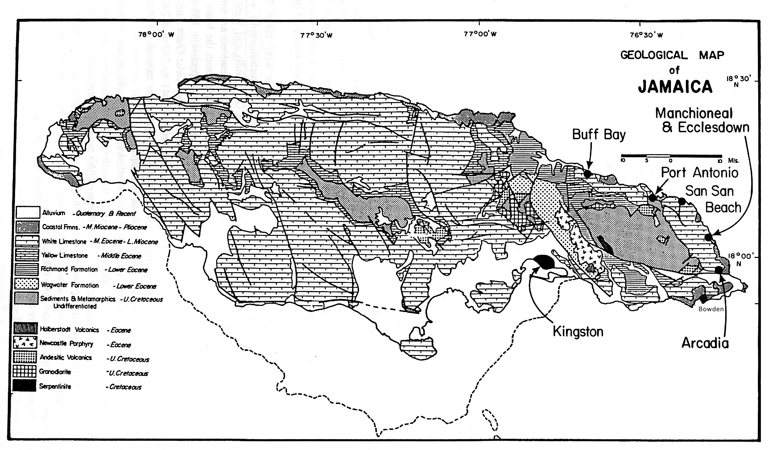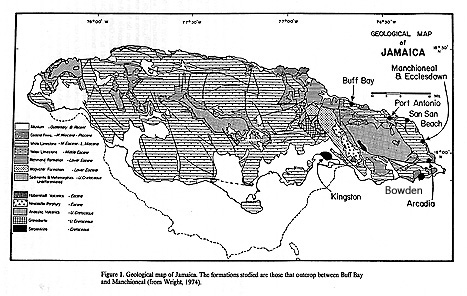 Geological map of Jamaica showing the location of Buff Bay and Bowden. Taken from